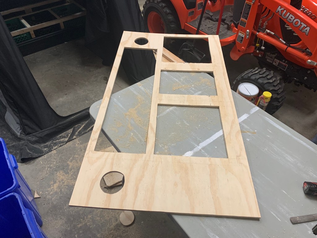 The idea behind the long cut out was to have storage for my auger, scoops, rods, etc. Anything that I bring that needs a little more length to store – as the milk crates are only 13″ square. The two circular holes are for marine speakers. The two square holes are where the seats will be. The middle, smaller, rectangular hole will be for the battery/electrical.