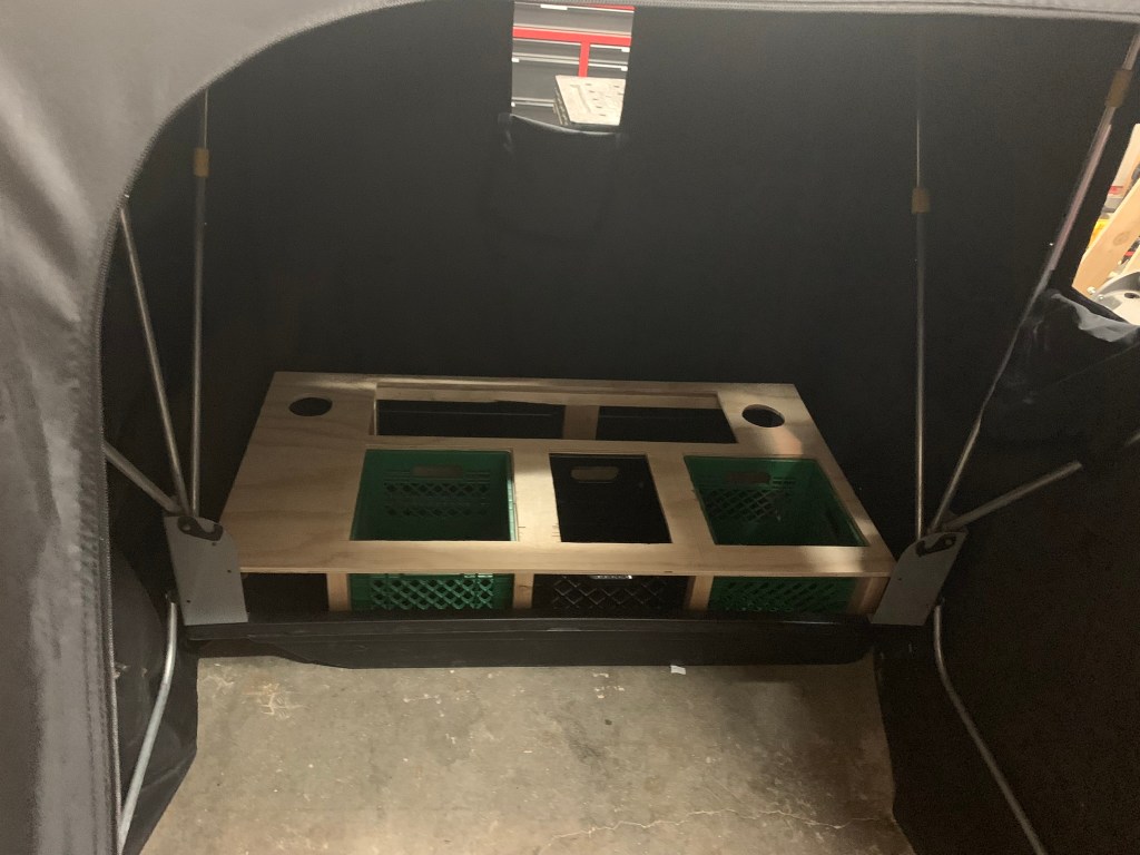 Next was to work on the platform. The top of the build. For this I used 1/2″ sanded plywood (the good stuff….). I traced out where the milk crates would sit and made the holes large enough that I wouldn’t lose storage space.