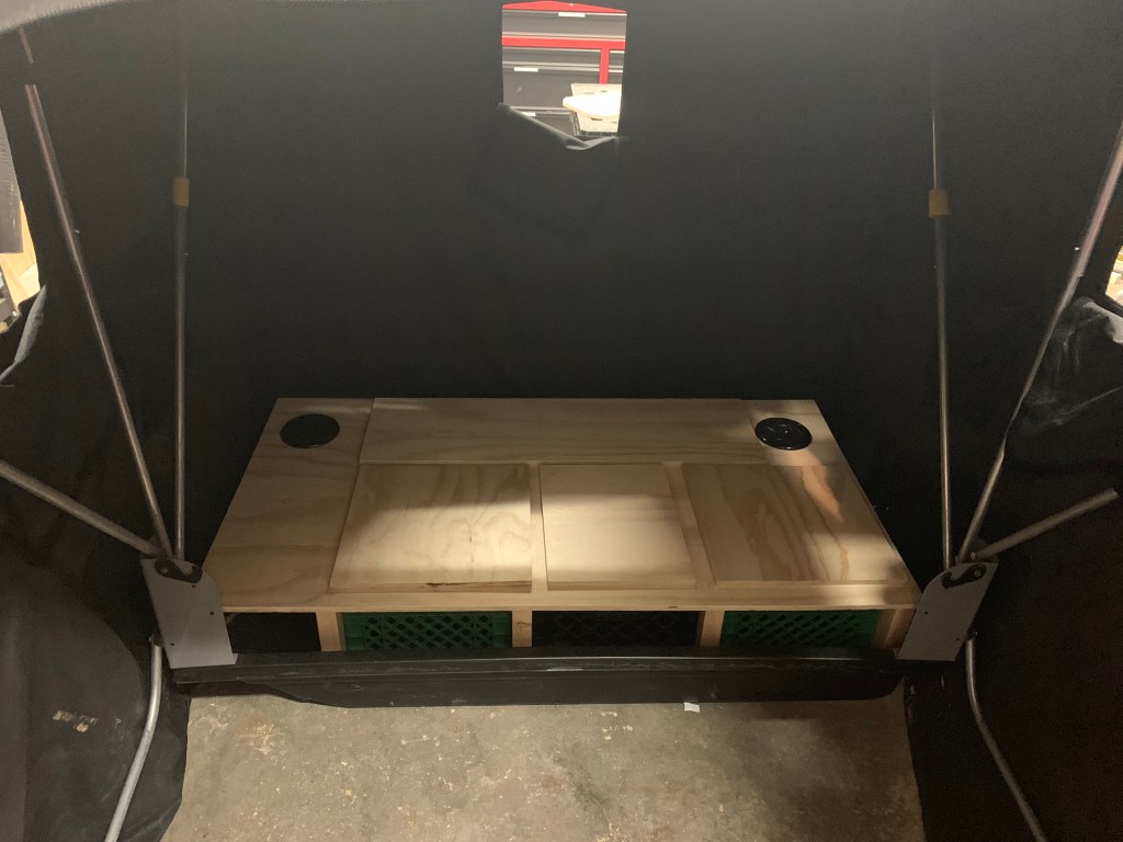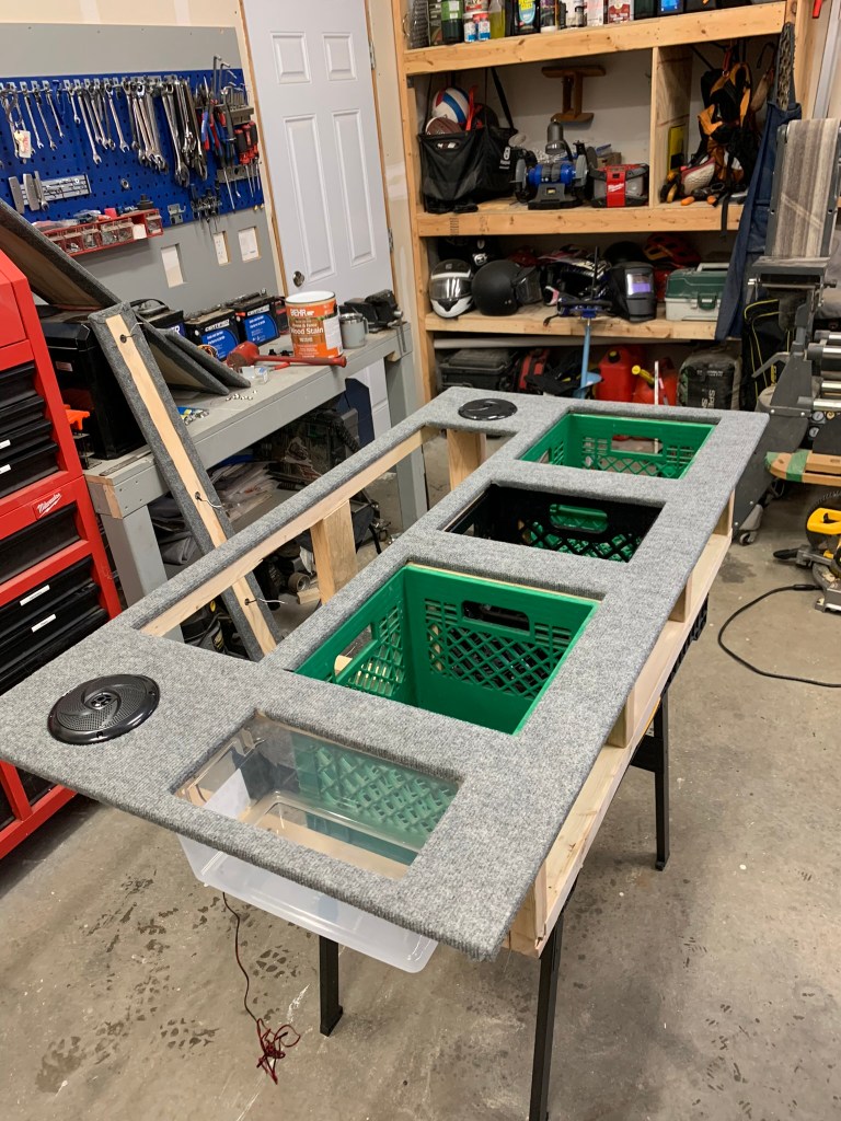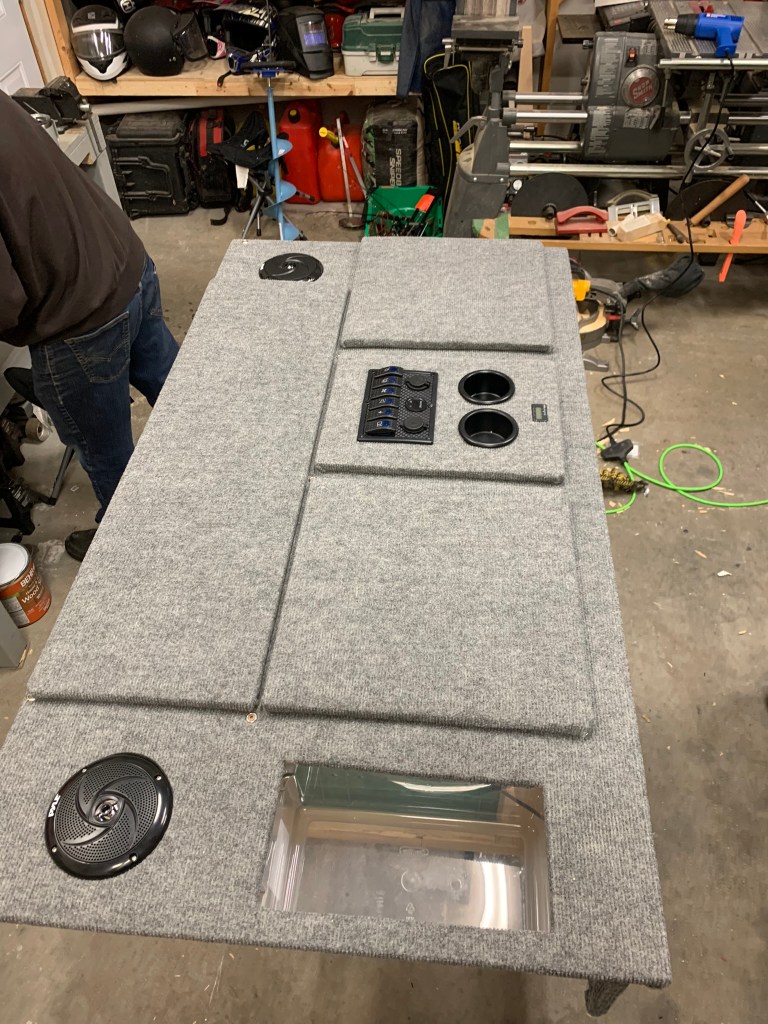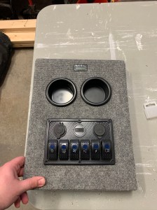 The part I was most excited about was the middle lid where I would be mounting the switches and cup holders. Take note – need a little bit extra space after carpeting – measure accordingly!