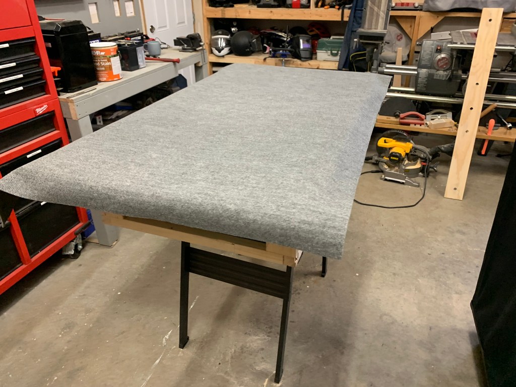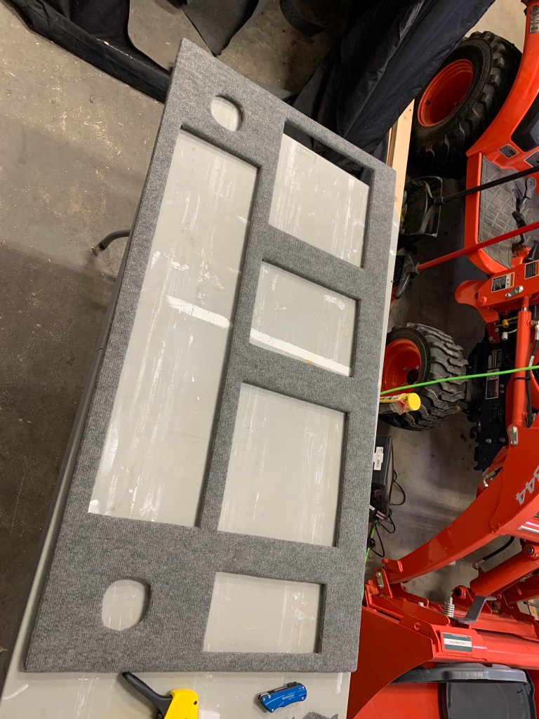 Skipping a bit of cutting process – for some reason I didn’t photograph the glow box or the electrical cut-outs until later. The carpeting was next: