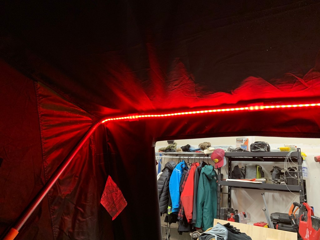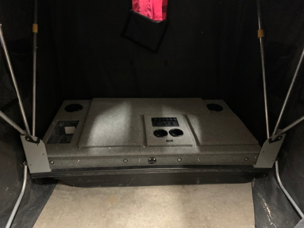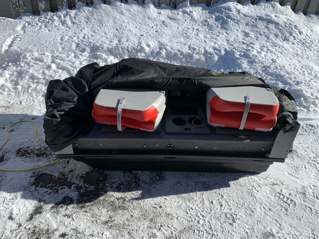 With respect to the weight of the whole package. At the end of the day, did I add weight? Yes. Is it substantial? No. I can lift the entire insert out of the sled myself. Fully loaded I can easily load it in to my vehicle and pull it on the snow/ice by hand. The only real additional weight I’ve added is the plywood and 2x2s. Otherwise, I’d still be pulling a tent, chairs, power box, all the gear, etc. So none of that changed. All in all I added about 12 sq ft of 1/2″ plywood and maybe a bit of weight with the seats (would be minor).