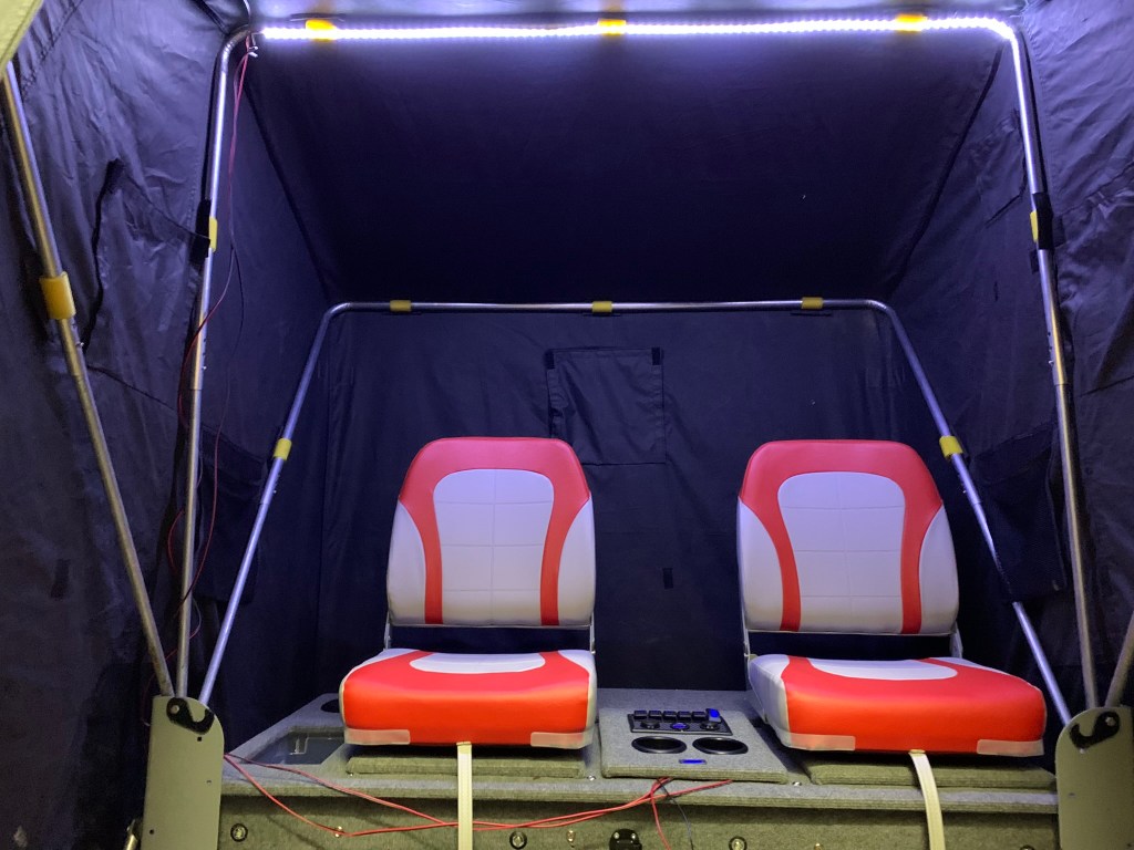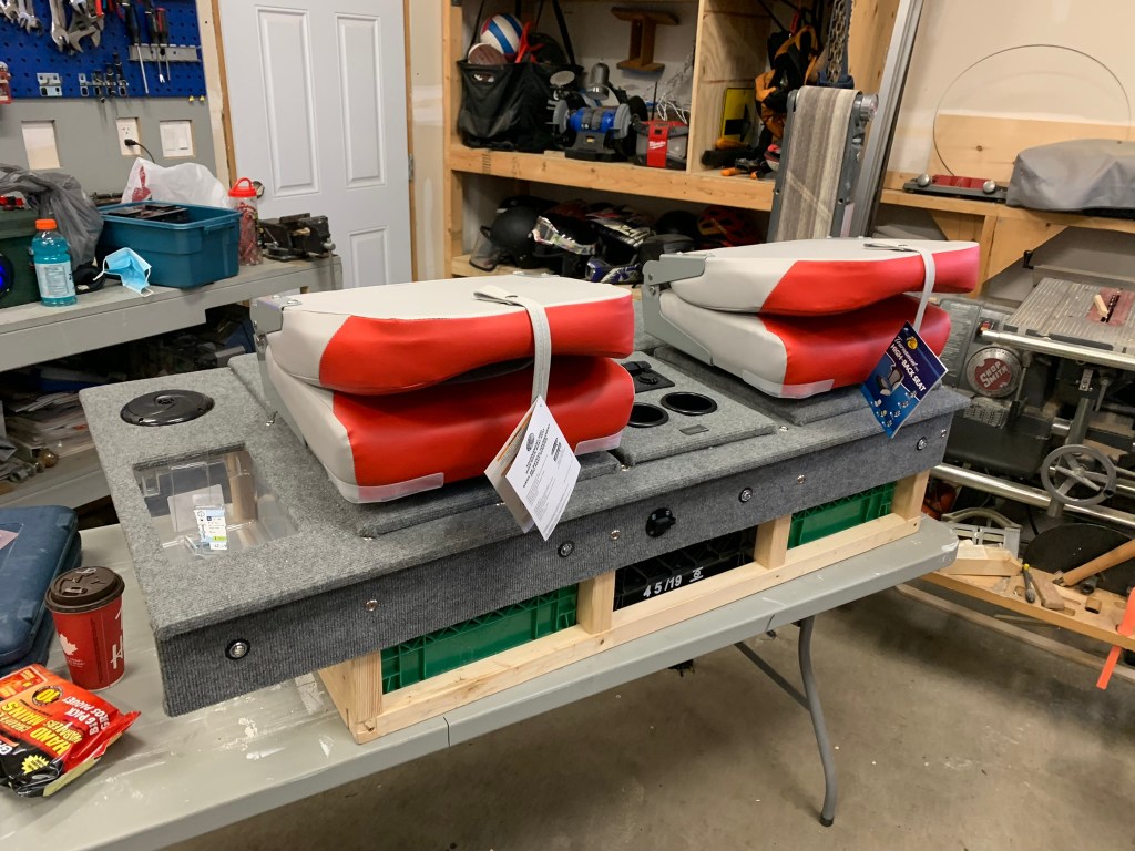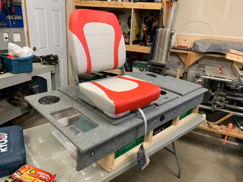 The electrical was important to me and I enjoyed planning that out. But one of, if not THE, most important parts was the seating. As the build stood at this point, you COULD just sit on it and be OK. It was high enough now that I wasn’t squatting on the ground, but I knew that I needed good seating to be able to spend a significant amount of time on the ice with this bad boy. I hummed and hawed for a long time about the seats (as well as pretty much everything else with this build, I guess!). I ended up deciding on some high back boat seats from Cabela’s.