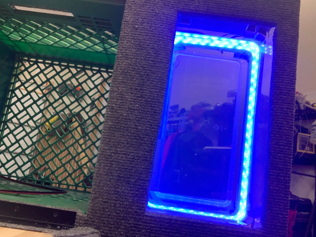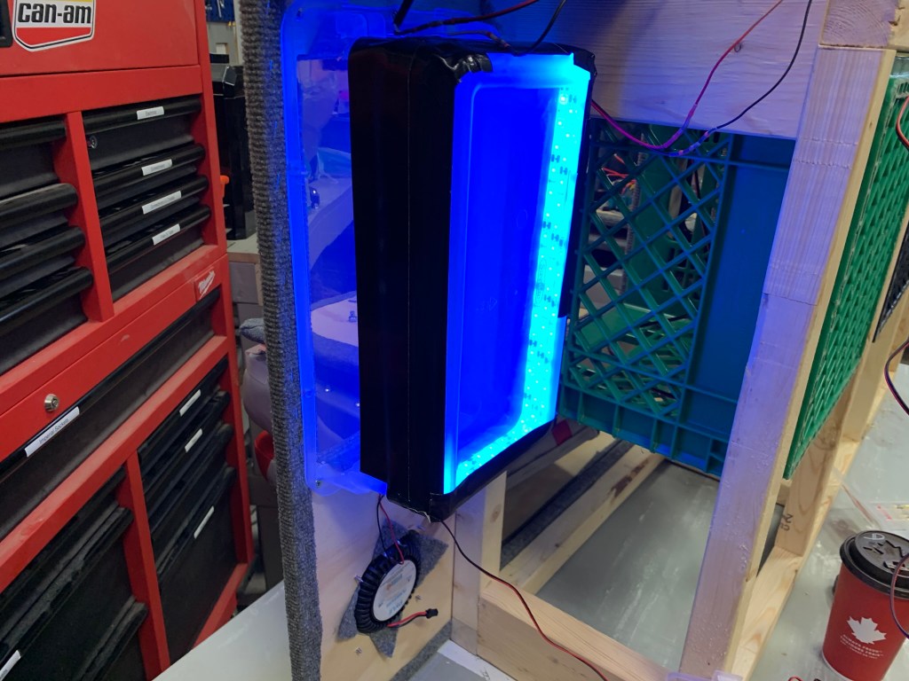 While I had the build out of the sled it was time to work on the glow box and electrical. For the glow box I used UV string lights from Wish. I wrapped them around the box a few times and then fastened with Gorilla Tape.