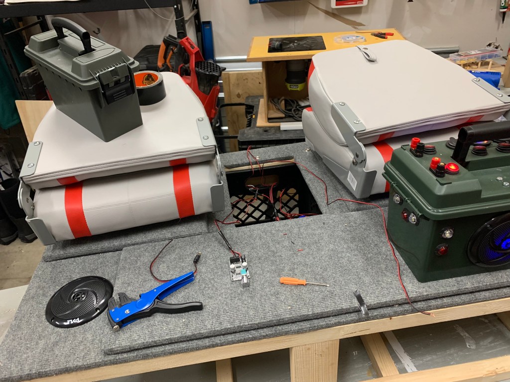 Inside the middle console I used a plastic 30cal ammo box to house the wiring and master switch. I had some of these boxes left over from power box builds and figured it was a perfect fit. For the overhead lights and heater fans I used banana posts in the ammo box for connection. Could’ve wired direct, but this gave me some more flexibility in what can be connected and also easily removed for transport, etc.