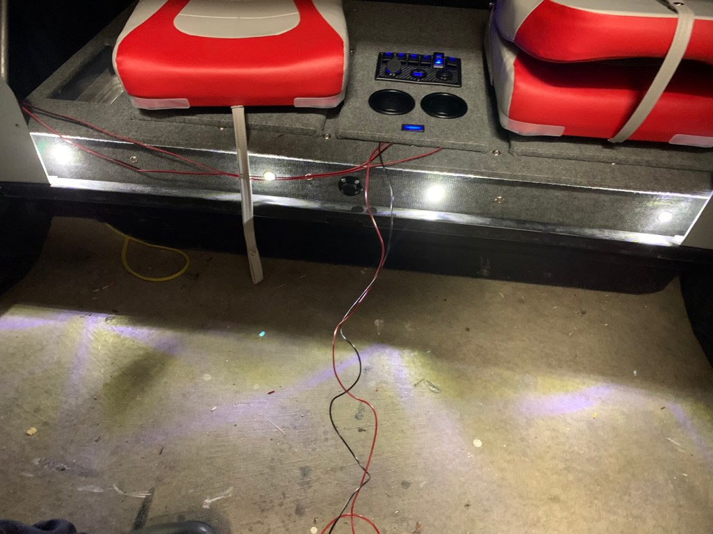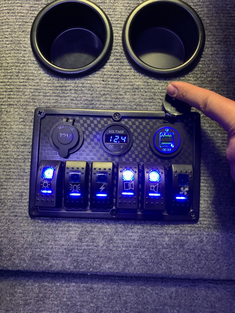 For the console I used a 6 switch panel with cigarette lighter, voltmeter and 2x USB ports. The planning for the switches was (from left to right): white overhead lights, white ground lights, red overhead lights, glow box, bluetooth/speakers, heater fan. The cigarette lighter port, voltmeter and USB ports were all connected to the master power switch so when the master is thrown – those all come on.
