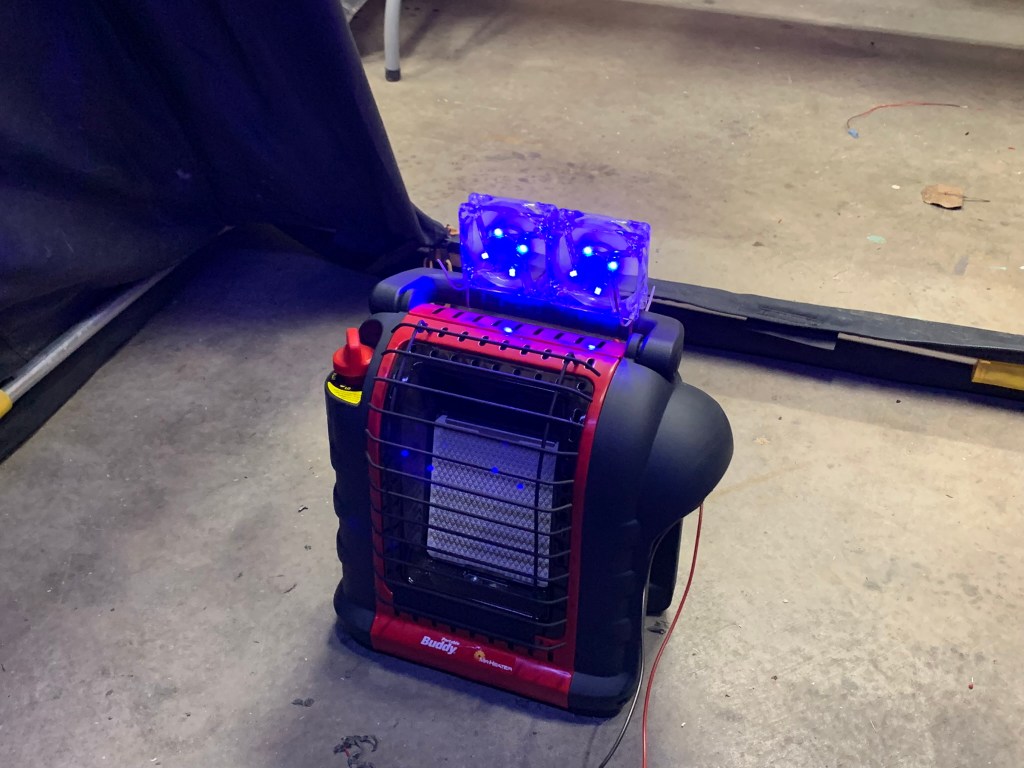 The heater fans I also picked up from Wish. A couple small computer fans with LEDs. I mounted these to the handle of my Buddy Heater with zip ties. Same idea as the overhead lights – I used quick disconnects for the wiring. These fans definitely move the heat around. I’ve had lots of people recommend a thermal fan like you’d set on a woodstove as they don’t require any power. I’m not opposed to that, just thought this was fun to do. If I do go that route in the future it just frees up a set of banana ports for something else – which I may have a plan for already…