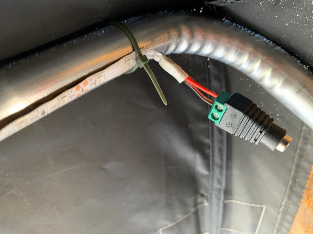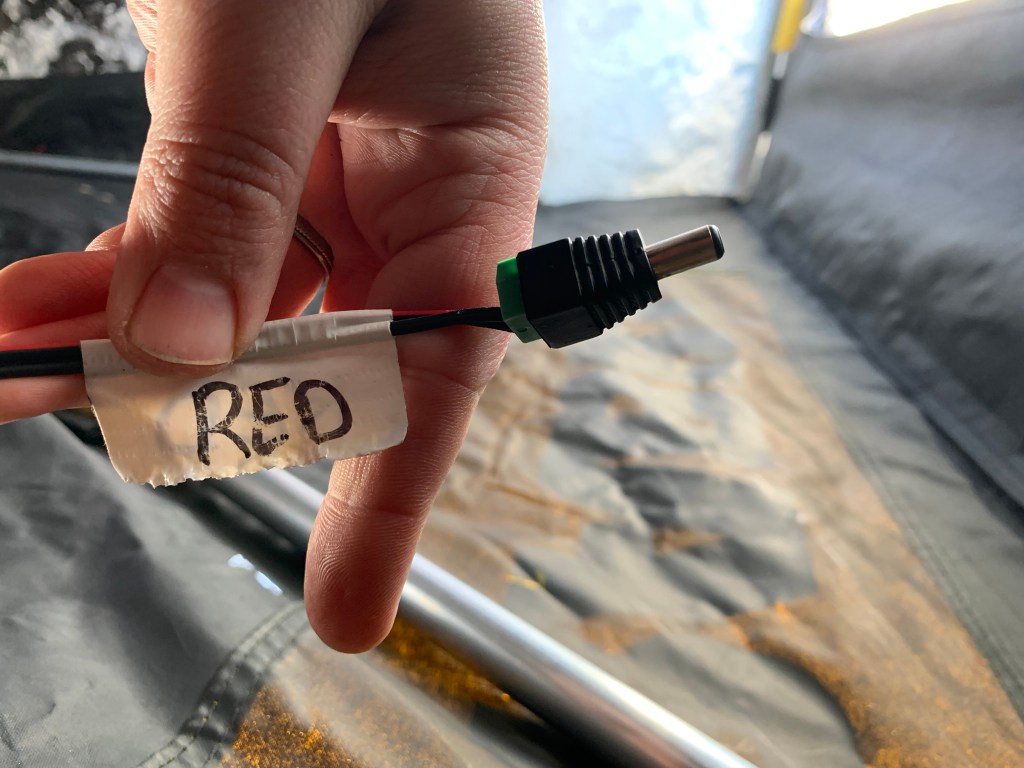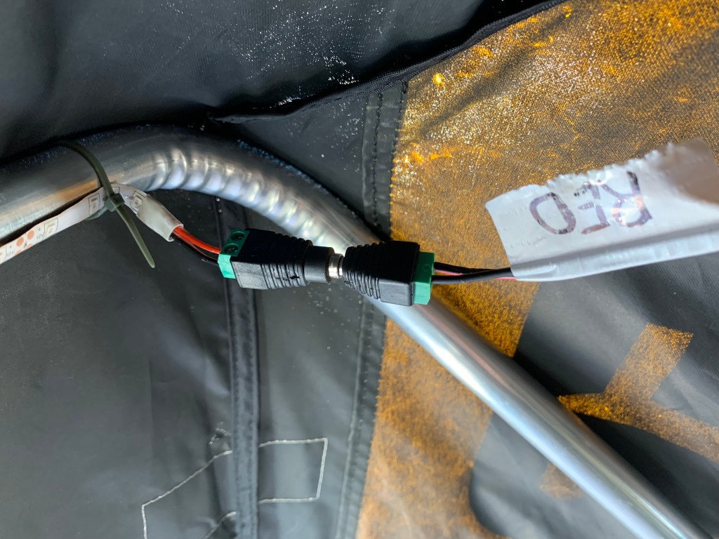 For the overhead lights I again use string LEDs from Wish. I fastened them to the overhead supports with the adhesive on the lights but also added some zip ties. This keeps the lights in place. I originally added quick disconnects at the ends of the LEDs but ended up changing them 5.5mm jacks simply for ease of connecting and disconnecting. I’ve found the spade connectors are sometimes quite tight (which is a good thing) but the wires are quite fine and the unplugging (on one occasion) ripped the connector right off. Yeah, my bad. So I picked up a package of these 5.5mm jacks that let you connect your positive and negative wires to each end. I found these were a good fit for the lights since the wiring is INCREDIBLY fine and will be handled more than any of the other wired areas.
